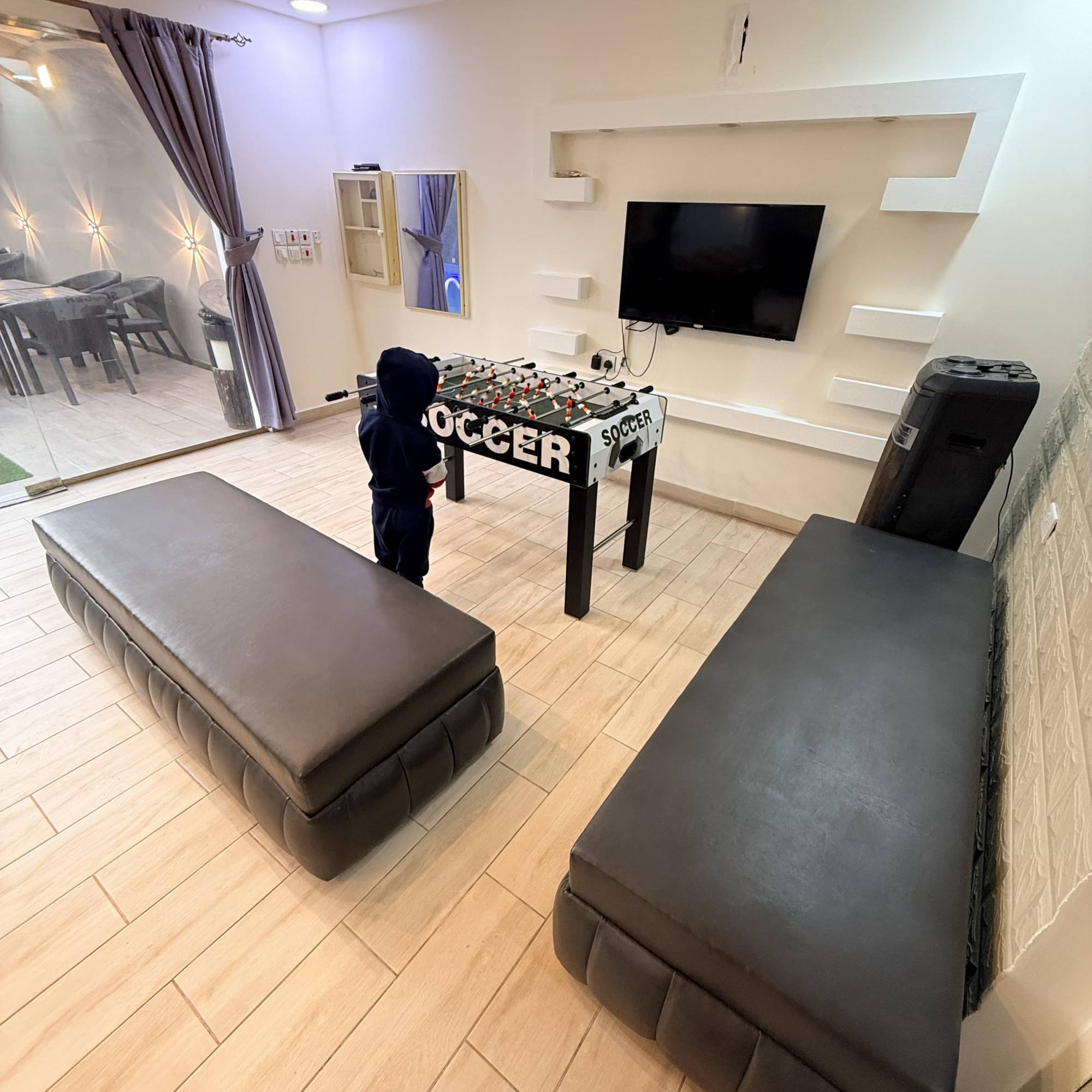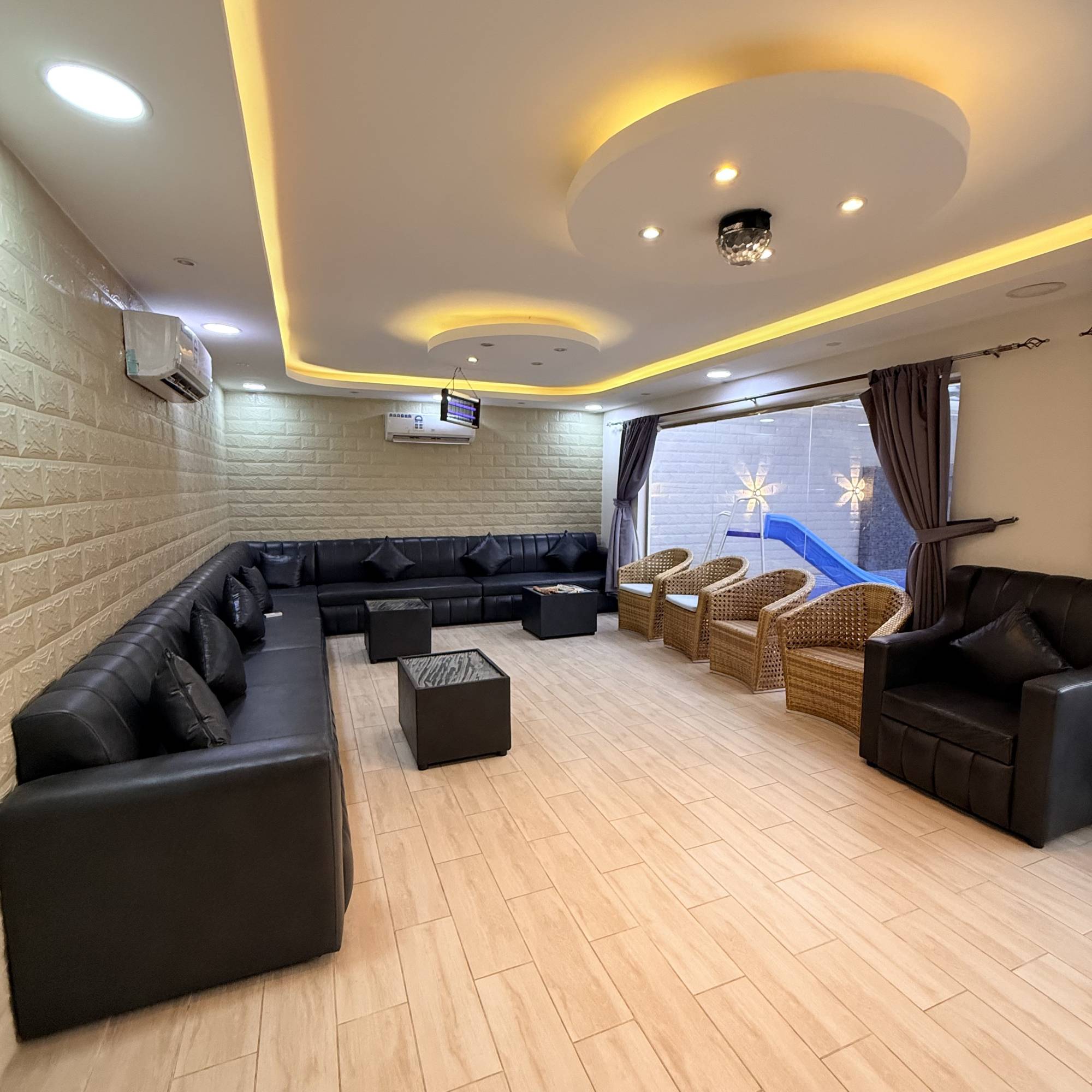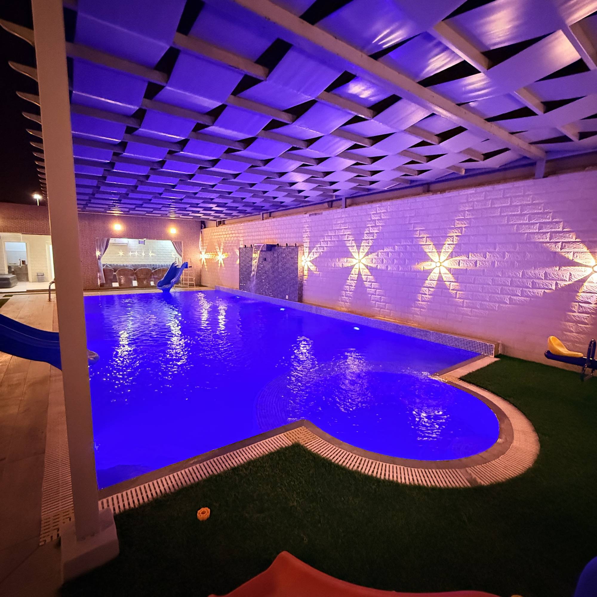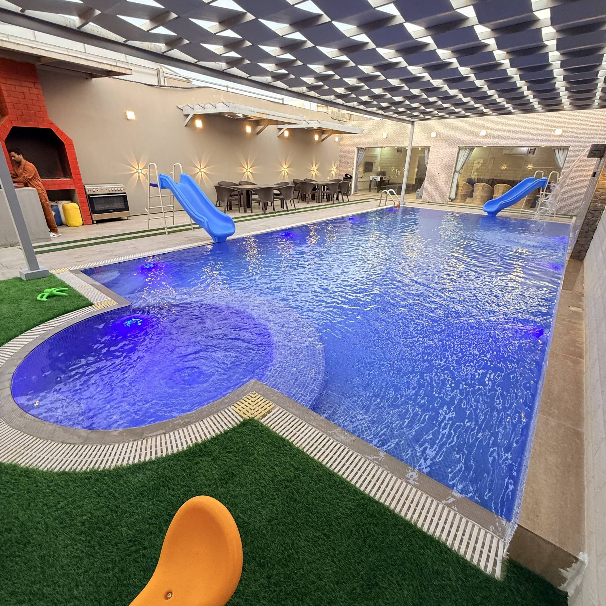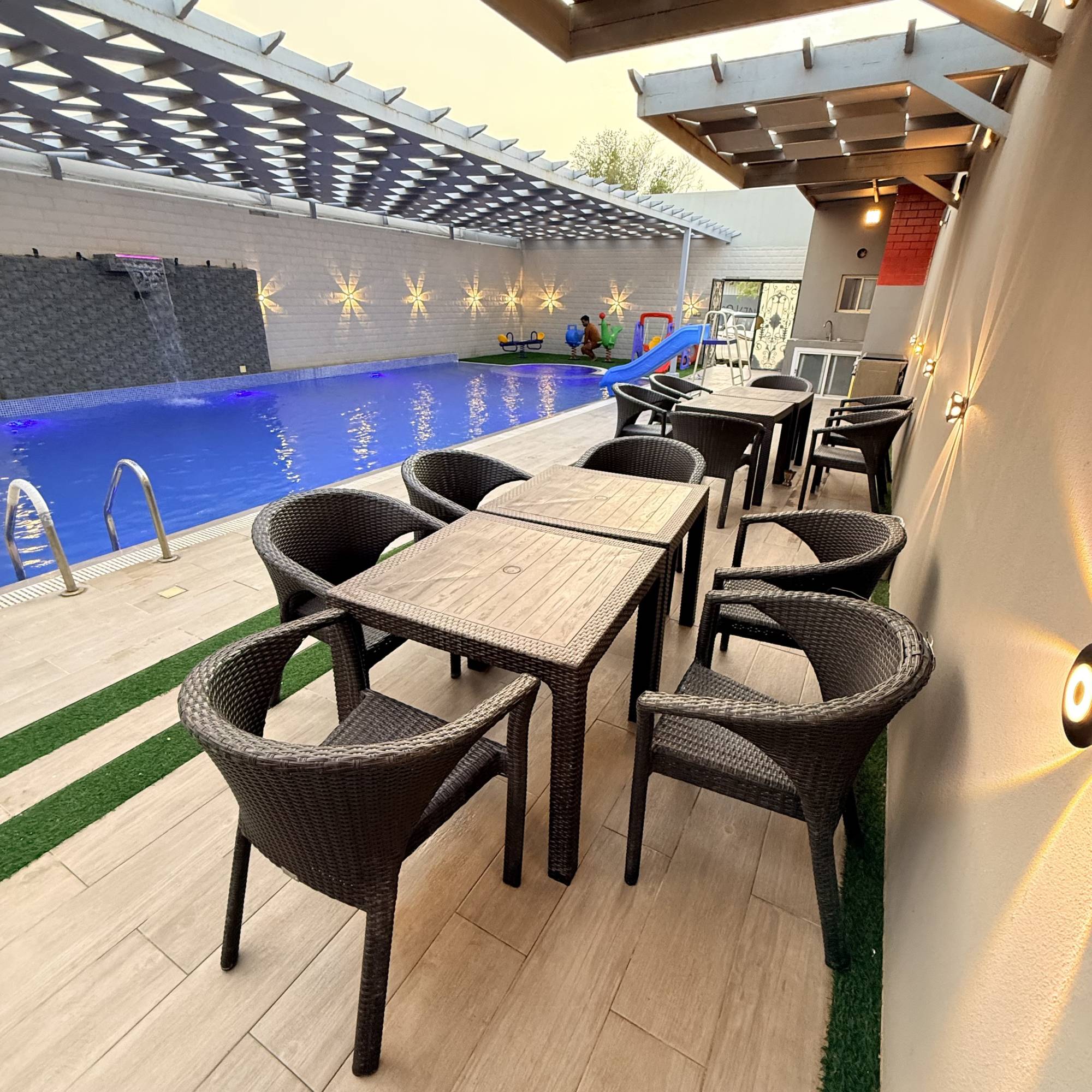 تتكون هذه الاستراحه المخصصة للعوائل والعزاب ، من مجلس رئيسي يسع الى 15 شخص و جلسة خارجية تتسع ل 12 شخص ومسبح خارجي 11 في 5.5 بعمق 175 سم .بالاضافة مسبح اطفال وغرفة نوم دورة مياة ومطبخ متوفر به فرن, ثلاجه، مايكرو ويف و العديد من المرافق مثل إضاءة إضافية، سماعات ، وركن الشواء ومواقف سيارات .