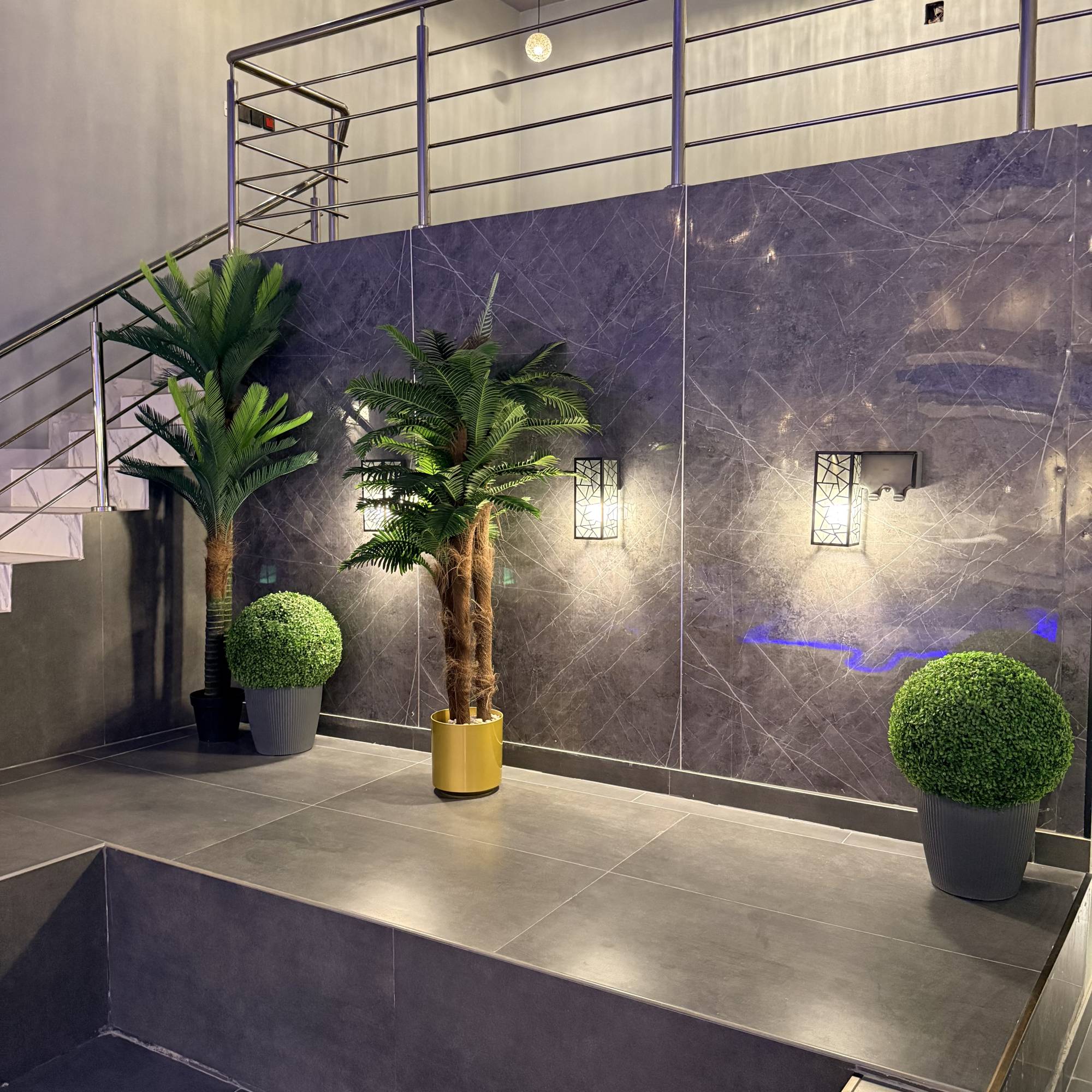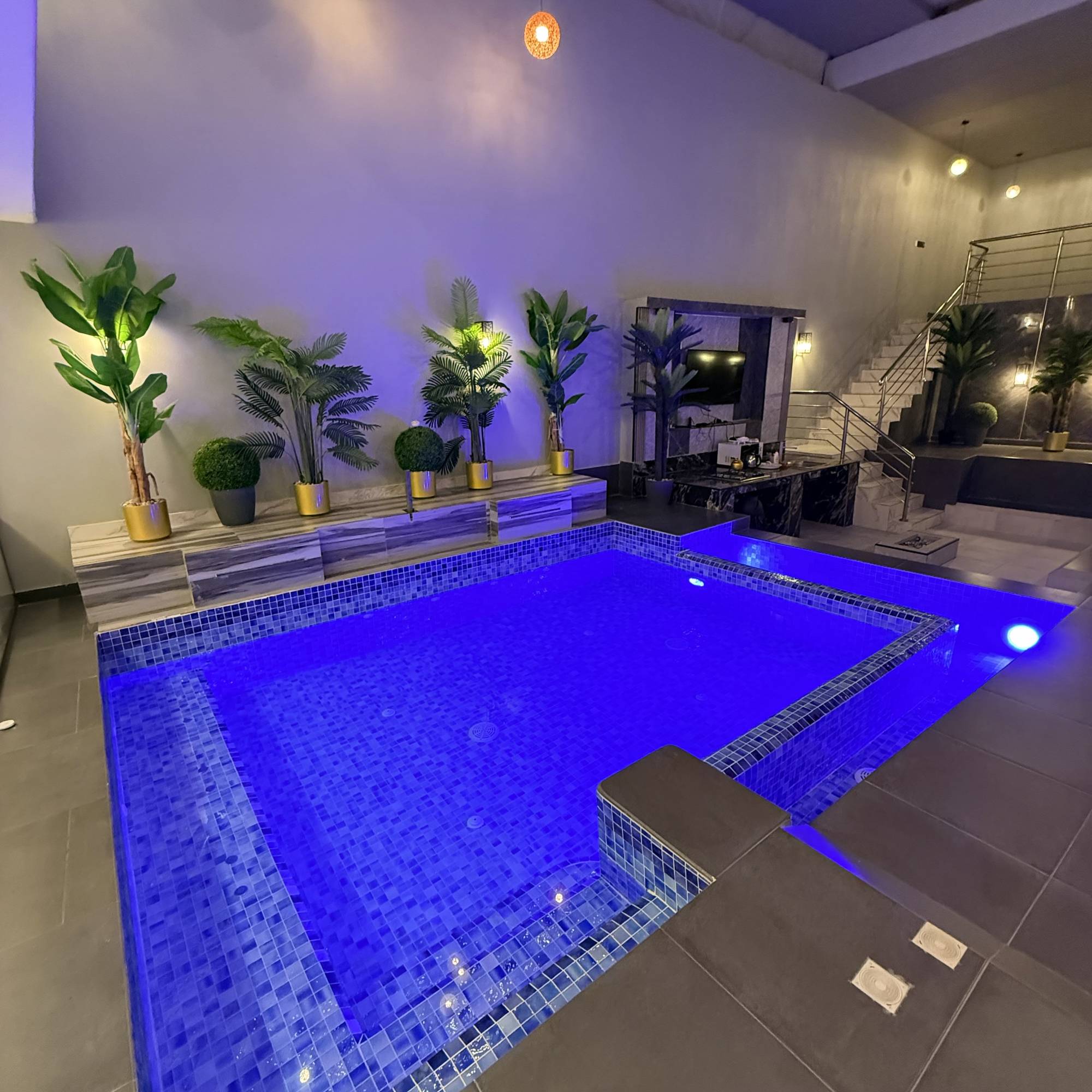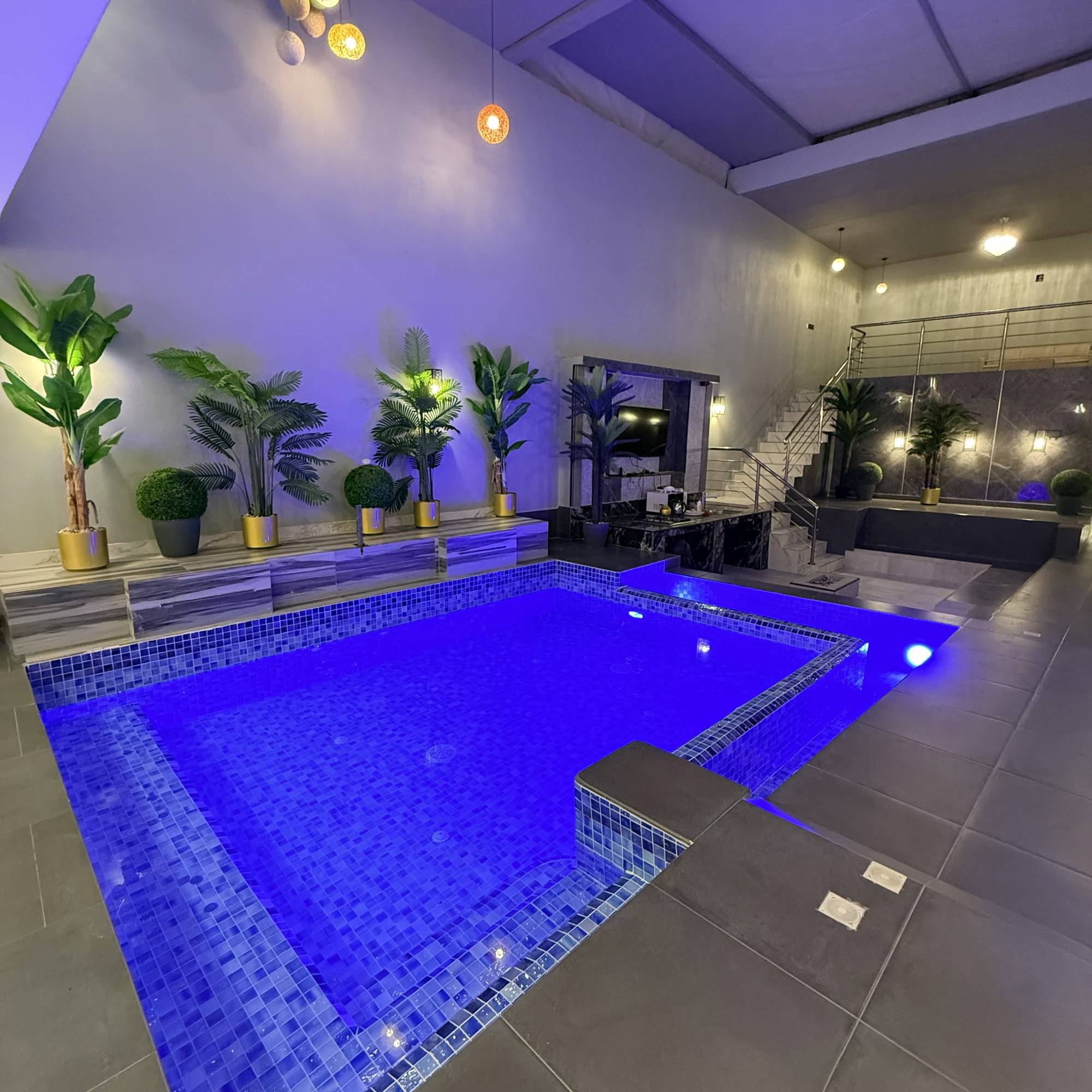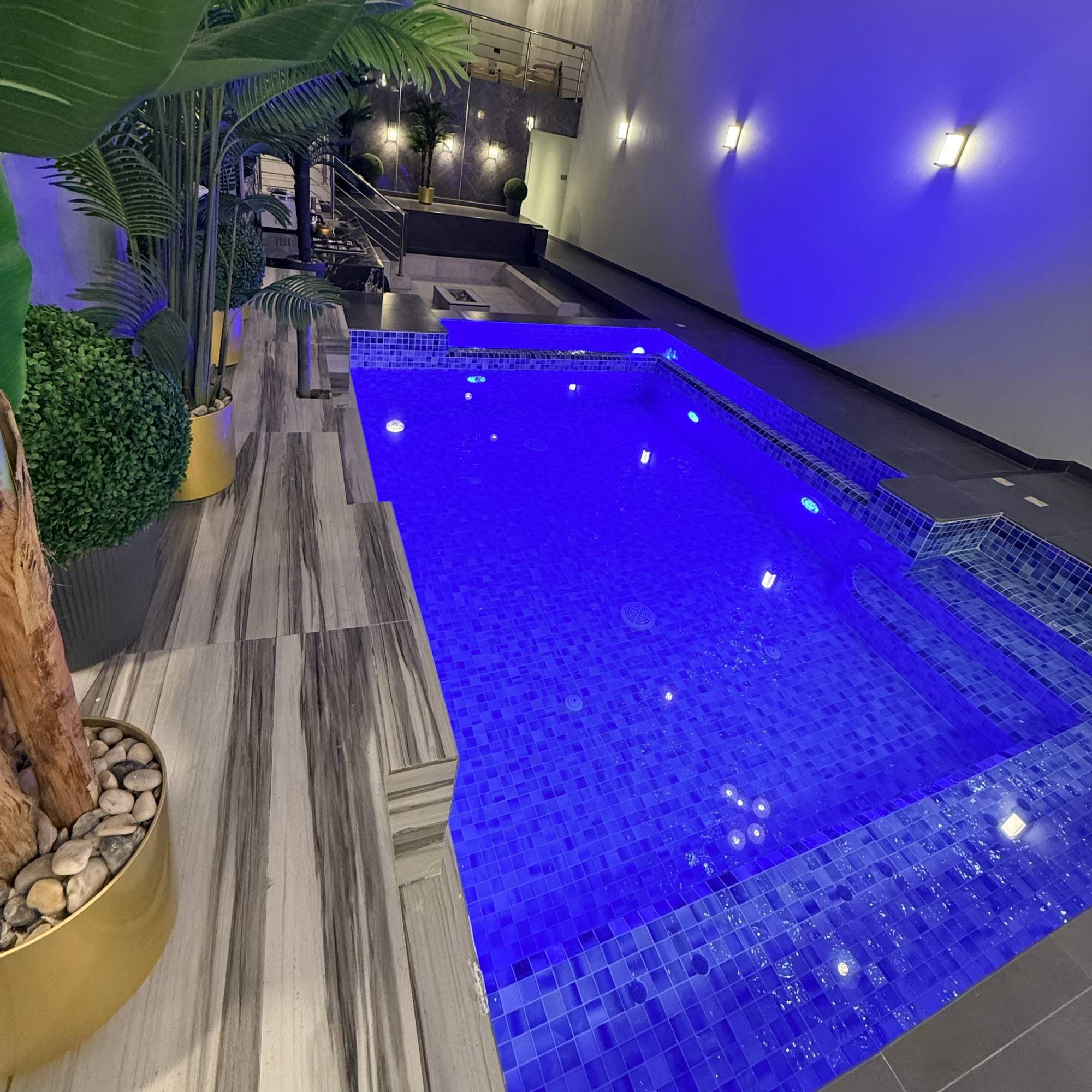 * المسبح: 5×4 بعمق 120 سم + جلسة مطلة على الجاكوزي.