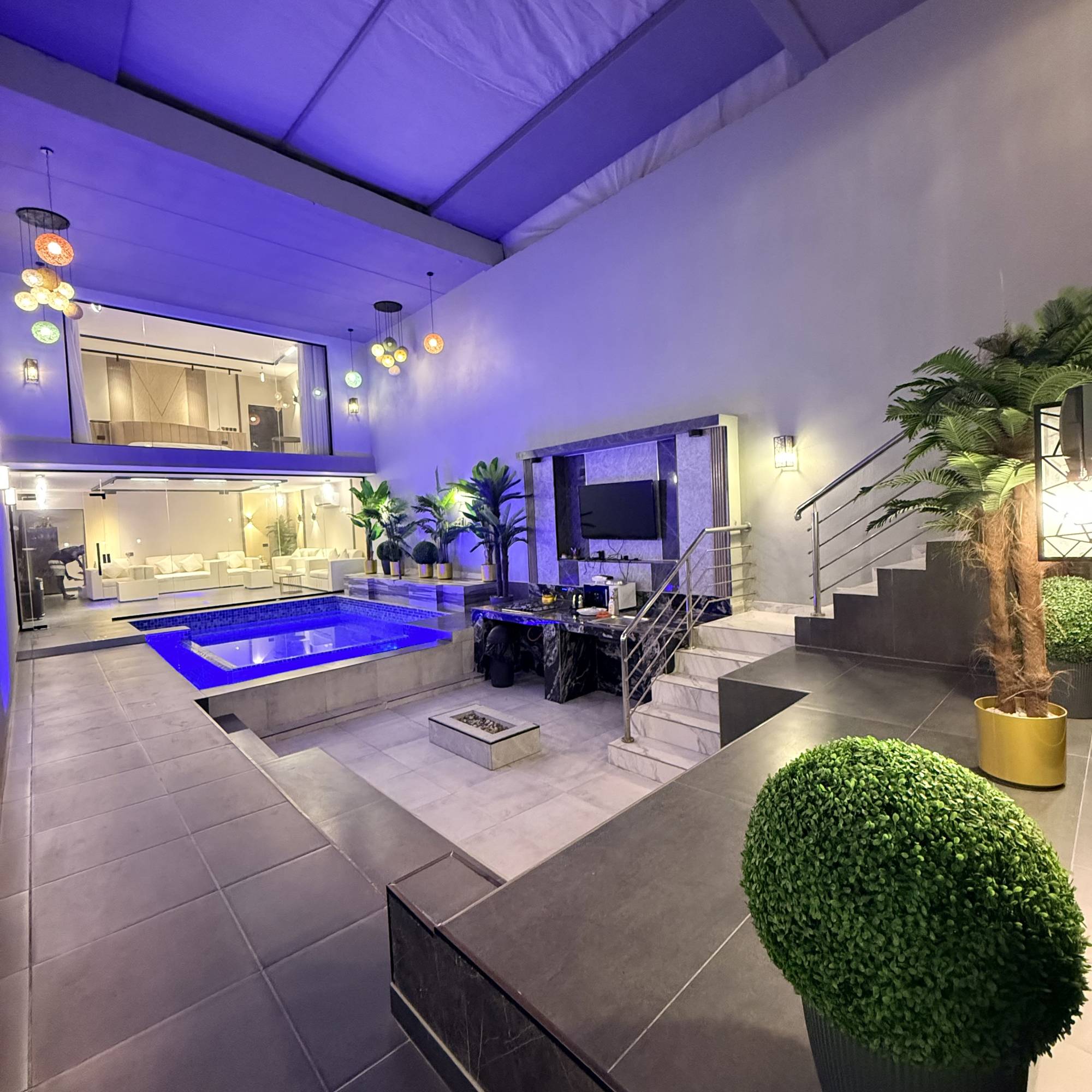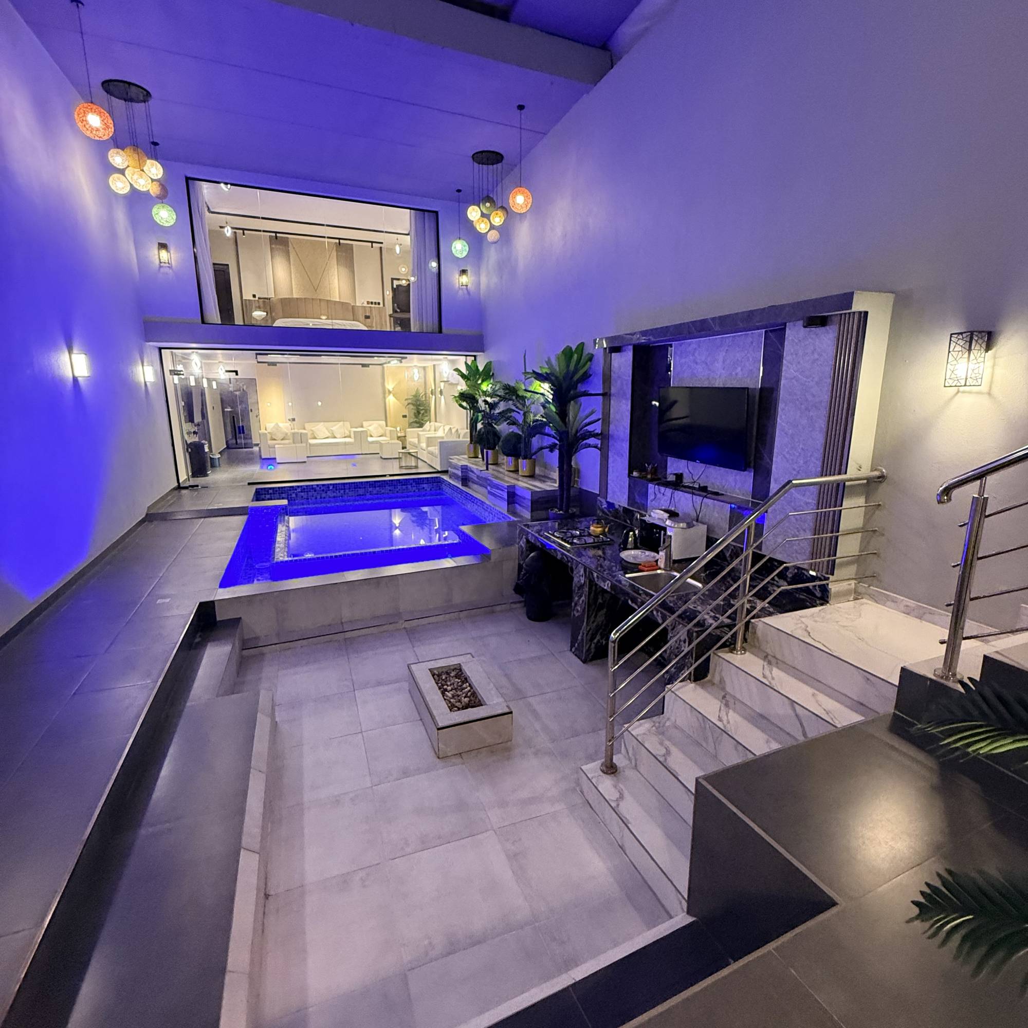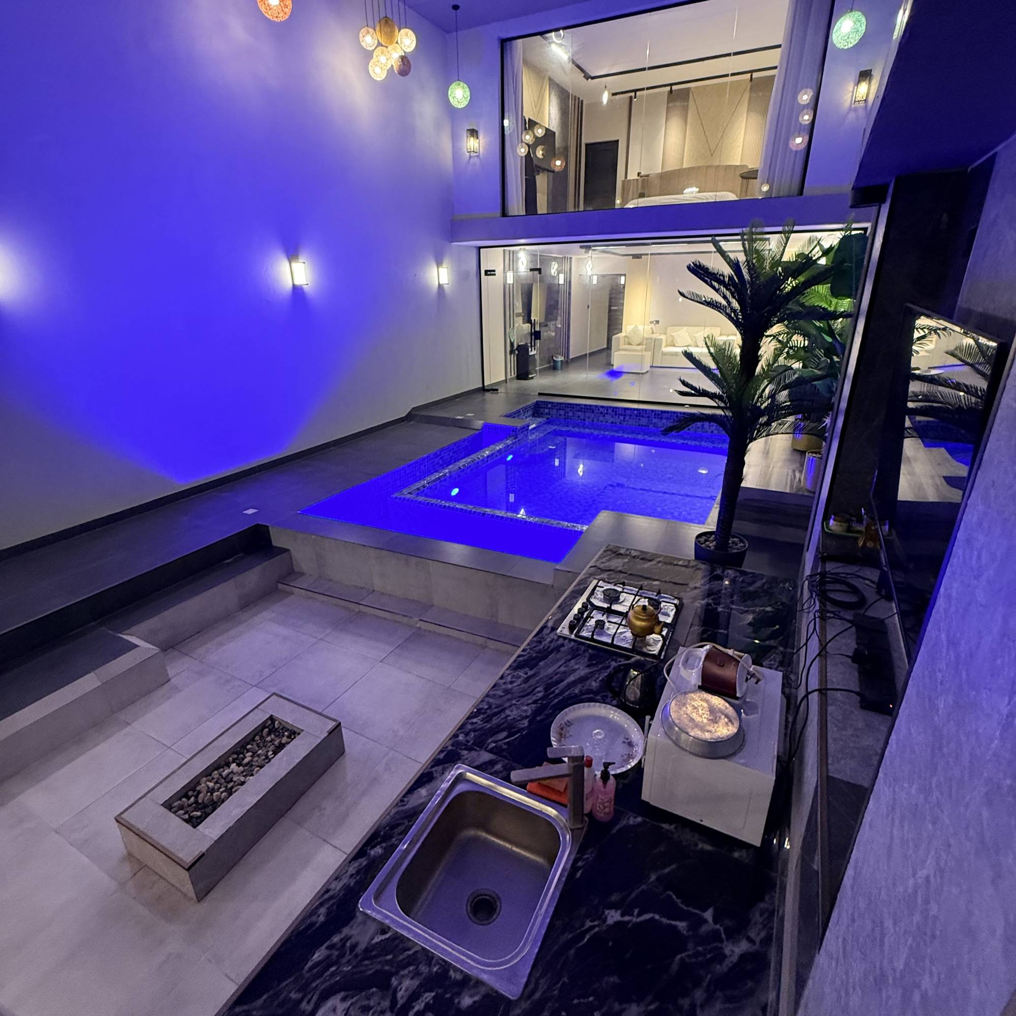 * التجهيزات: مطبخ خارجي متكامل، 3 تلفزيونات، وسماعة ديجي.