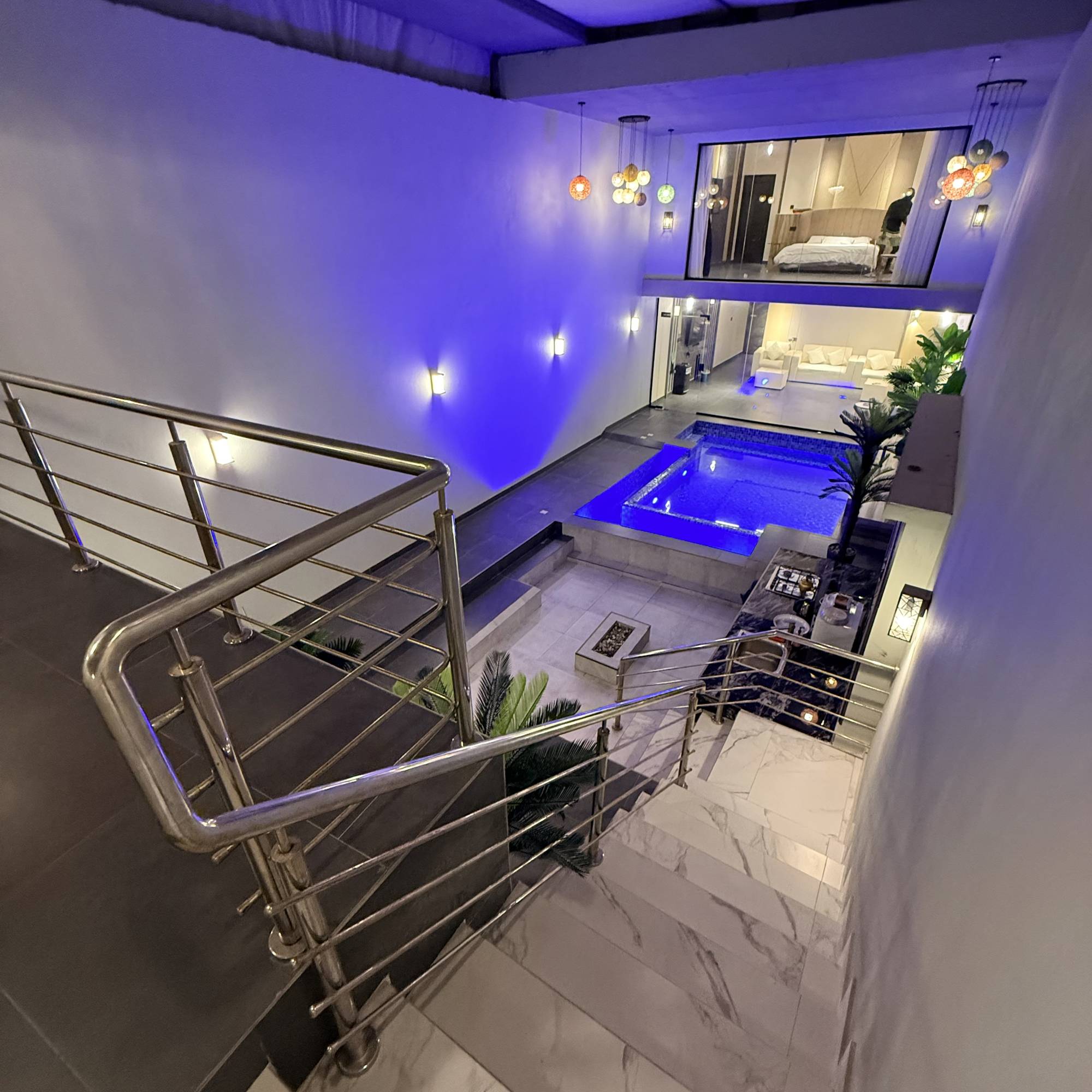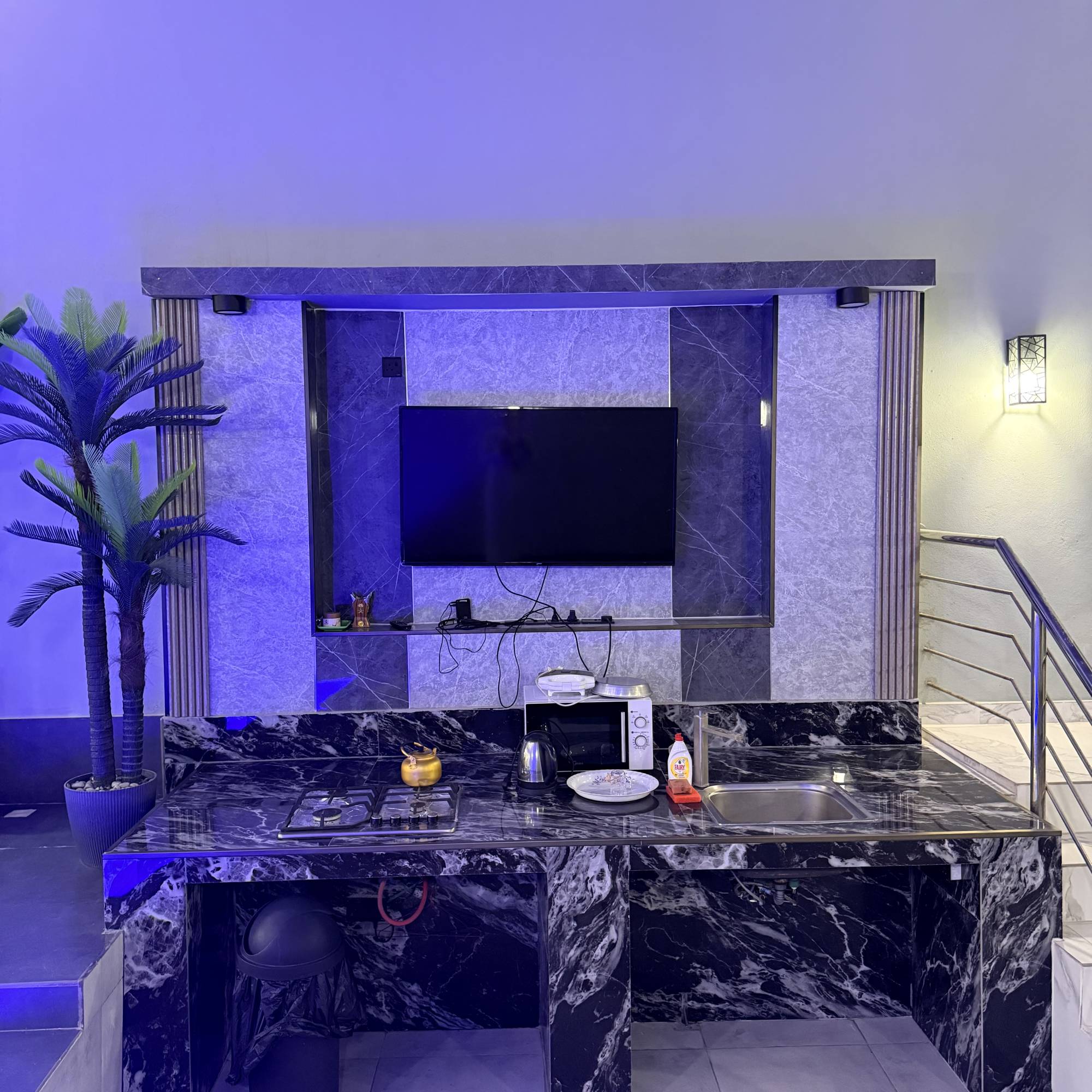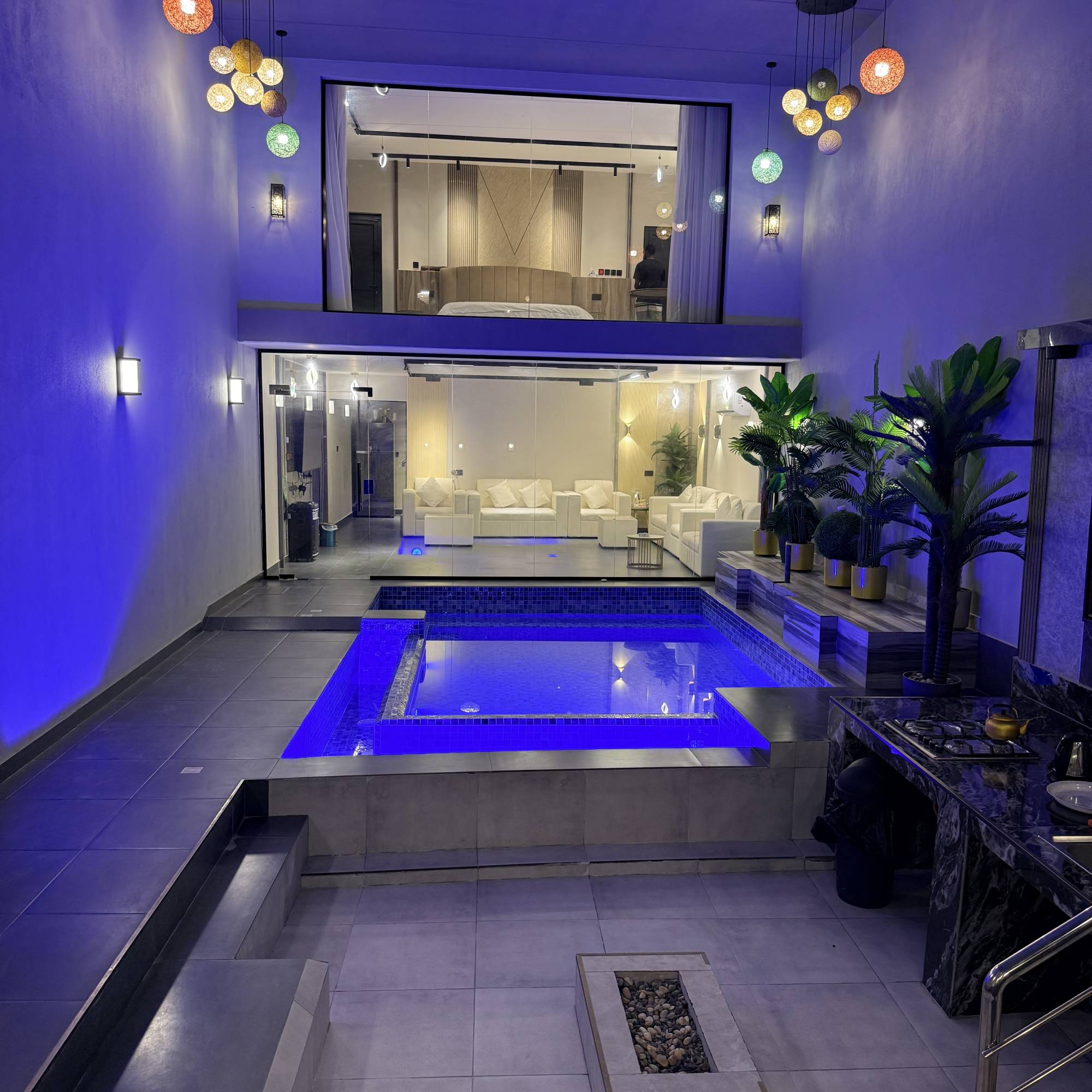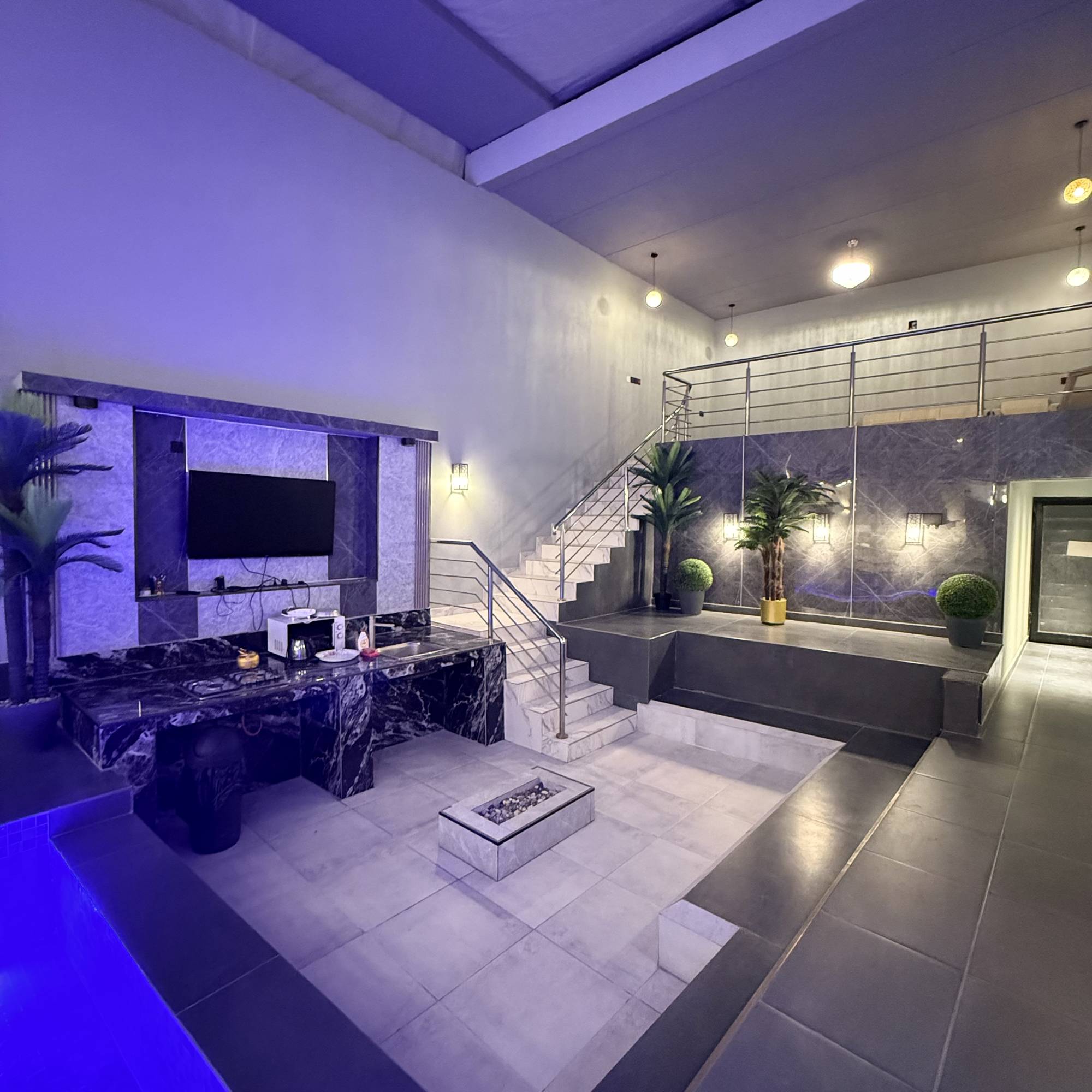* التجهيزات: مطبخ خارجي متكامل، 3 تلفزيونات، وسماعة ديجي.